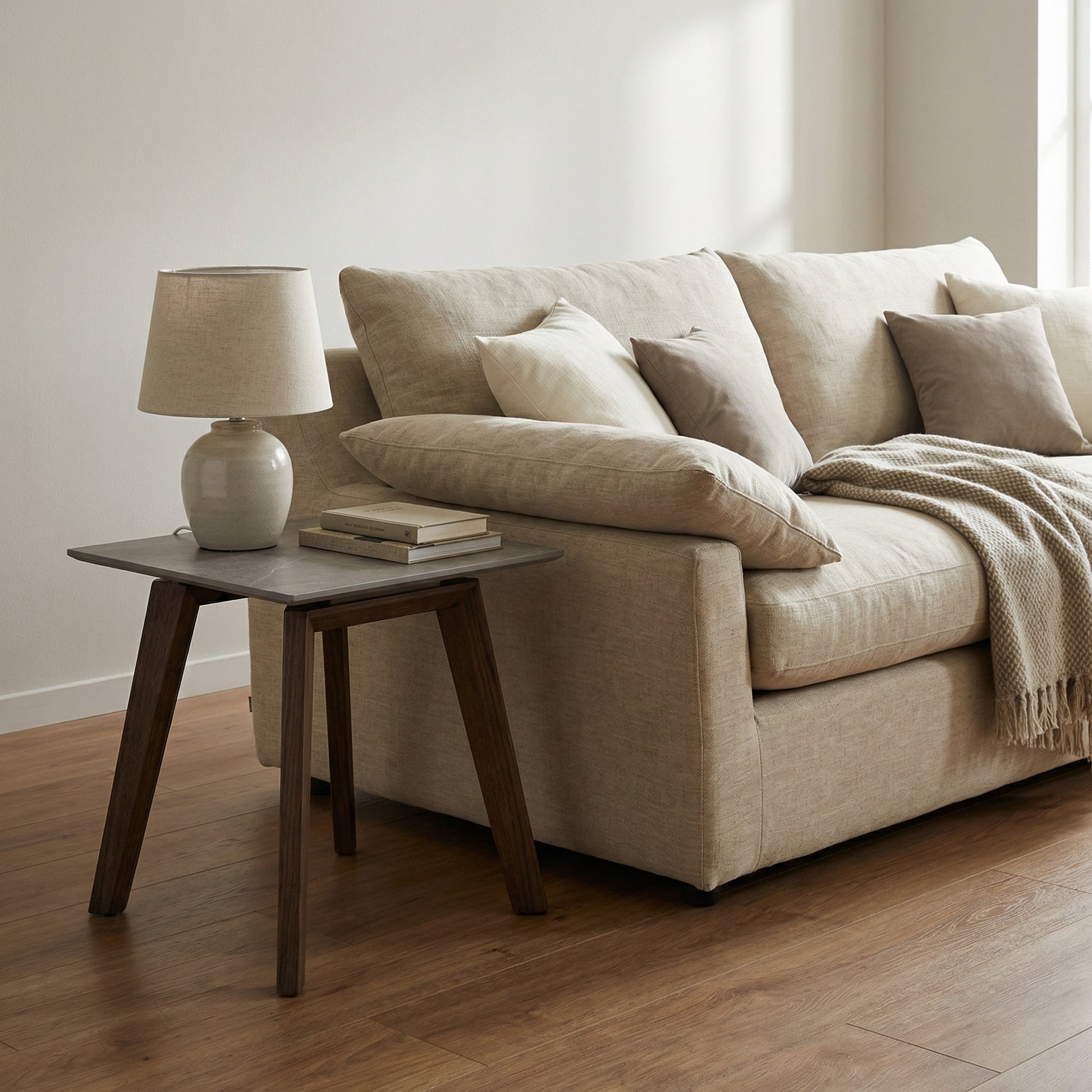 The Axton Lamp Table in Latte combines elegance with practicality. Crafted from bird wood with a dark brown walnut veneer, it exudes natural charm. Its sintered stone tabletop is heat and cold-resistant, waterproof, scratch-resistant, and stain-proof, making it easy to maintain and clean.