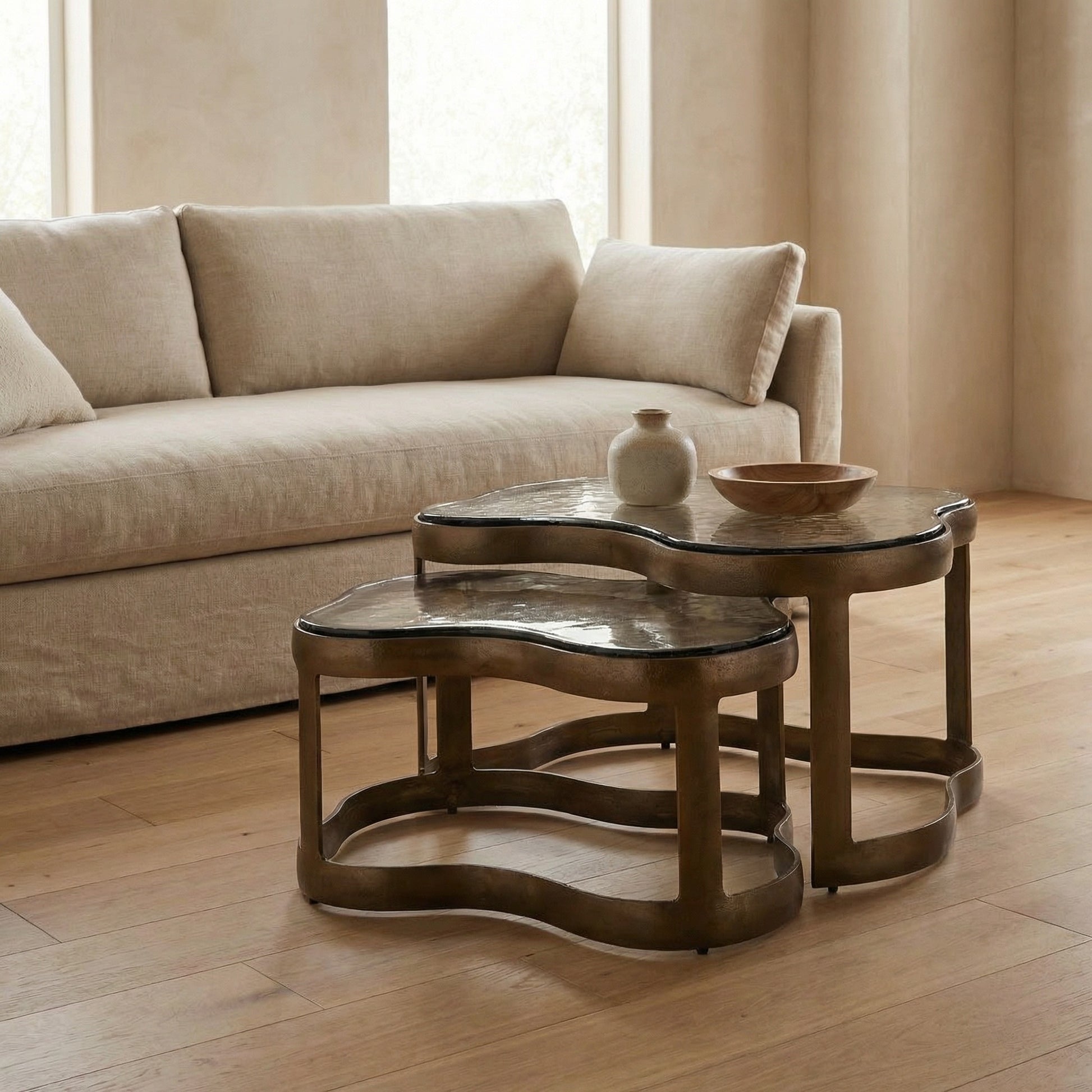 This sculptural coffee table features a striking dual-level design with organically curved tops that nest seamlessly together. Finished in a rich bronze tone with a subtle textured surface, it brings depth and sophistication to any living space. The fluid metal base echoes the soft contours above, creating a cohesive, modern statement piece that blends artistry with function. Perfect for contemporary interiors seeking a bold yet elegant focal point.