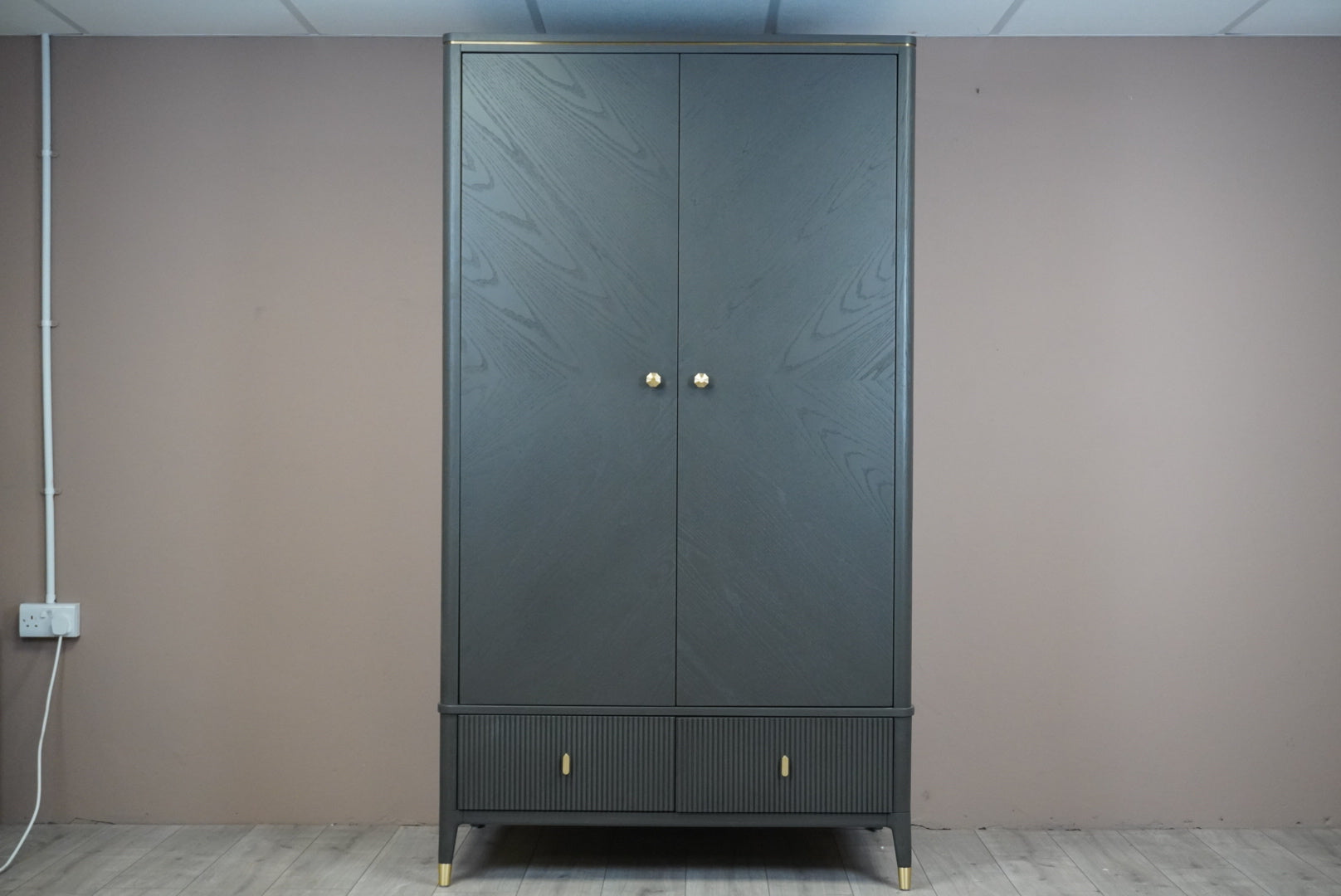 Diletta 2 Door Wardrobe in Ebony – a luxurious addition to your bedroom from our exclusive Luxury Bedroom Collection. Inspired by Art Deco design, this wardrobe exudes elegance and sophistication. Crafted with ash wood veneers hand-laid in a V match pattern, it showcases meticulous attention to detail. The ebony-coloured wood and brushed gold metal hardware and inlay add a touch of opulence to your bedroom decor.