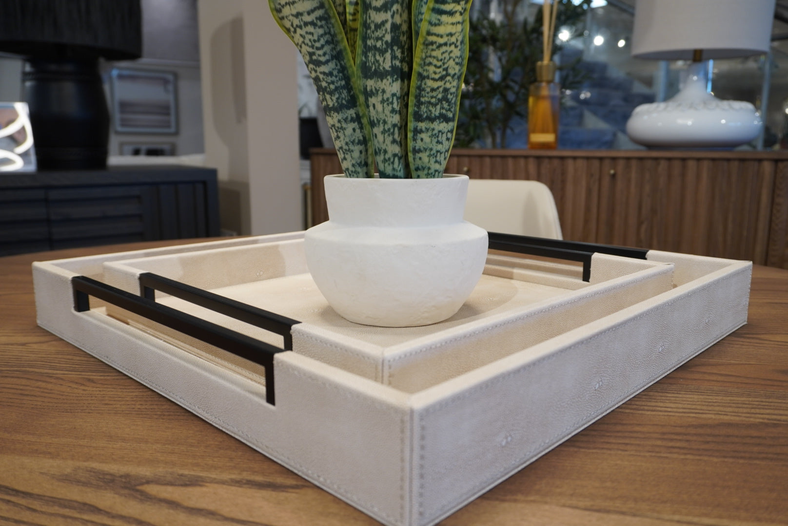 Add a bit of greenery to your room with his eye catching faux snake plant. The realistic leaves feature the distinctive pattern of the snake plant, perfectly complemented by plan matt ceramic pot.