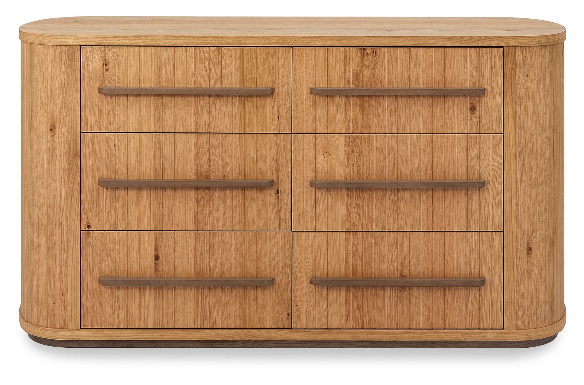 The Montreal Bedroom Range brings a sense of crafted character to contemporary spaces, combining knotty oak veneers with a soft weathered finish and expressive grain. At its centre, the bed frame sets a confident tone with turned oak legs and a pearl crushed velvet headboard that introduces texture and contrast. Curved profiles and subtle groove detailing run throughout the range, lending cohesion and balance to each piece. Generous drawer storage is provided through softly contoured chests and elliptical nightstands, available in both three-drawer and open-shelf variations to suit a variety of room layouts and lifestyles. The Dressing Table pairs a central drawer with shelving concealed behind its pillar-like sides, offering a streamlined look with functional detail.